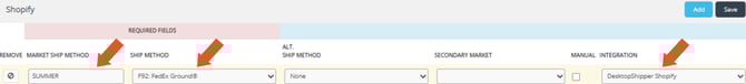 Below is an example of the incoming ship-method "Summer" being mapped to F92: FedEx Ground, and an additional mapping has been added so that the mapping applies to orders coming from Shopify only.