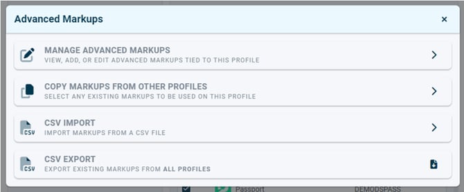 An efficient way to streamline the markup settings is by importing a CSV file with one or more markup configurations for specific profiles. When the CSV is imported, only the profiles listed in the file will be impacted. This method simplifies the process of adding markups to multiple profiles simultaneously, eliminating the need to manually input markups for each profile individually.