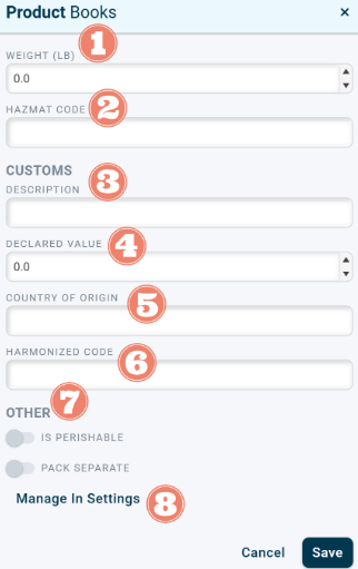 8. Clicking "Manage in Settings" will take you to the Product database where these fields can be set on items for future use.