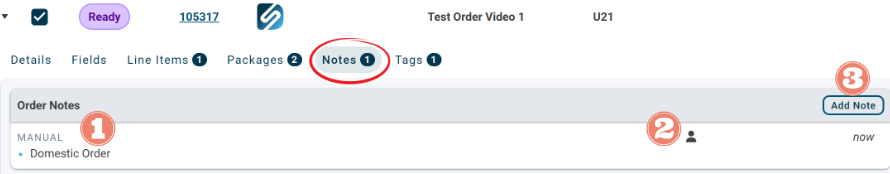 1. Any notes present on the order appear here. The sample note specifies that the order is Domestic.